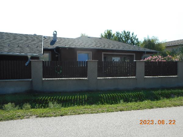 A helyileg illetékes polgármesteri hivatal által kiállított adó-és értékbizonyítvány alapján az ingatlan 800 m2 kivett lakóház, udvar megnevezésű családi ház. Közművesítettsége: víz, villany, gáz, csatorna. A felépítmény jellemzői: földszintes, beton alapozású, teljes értékűen szigetelt, tégla falazatú, életkora: 19 év, jó állapotú, 156 m2 alapterületű. Helyiségei: 3 szoba, konyha, 2 fürdőszoba+WC, kamra, 2 gardrób, előszoba, étkező+nappali, háztartási helyiség. Melléképület jellemzői: 28 m2 nagyságú, beton alapozású, tégla falazatú, jó állapotú garázs+tároló (nem hivatalos melléképület). Védőterület, hidrogeológiai "B" védőövezet. Vezetékjoggal terhelt 10 m2 nagyságú területre az ELMŰ Hálózati Kft. javára. Adós tulajdonrészét elidegenítette, a javára bejegyzett haszonélvezeti jog a Vht. 137. § (2) alapján törlődik.