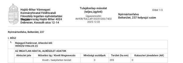 236 hrsz., belterület, kivett, beépítetlen területe: 295 nm. A földrészlet jellemzői: tulajdoni jellege: személyi, fekvése : belterület, megközelíthetősége: kiépített út, közforgalmi közlekedéstől való távolsága: 400 m.