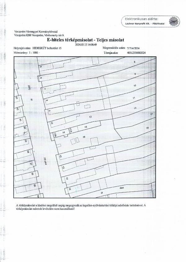 1 766 m2 alapterületű kivett beépítetlen terület. Megközelíthetősége: udvaron keresztül; közforgalmi közlekedéstől való távolsága: 800 m; magánerőből beépíthető: nem; közművesítettség foka: nincs; talajának minősége: kötött; növényzete: művelt; kerítése van. Az ingatlan külső megtekintés alapján került értékelésre. Az ingatlanról készült képfelvételek tájékoztató jellegűek, a térképrajz alapján behatárolható az ingatlan. Az adós személy Hidegkút belterület 15 helyrajzi számú ingatlana vonatkozásában is árverési hirdetmény került kitűzésre.