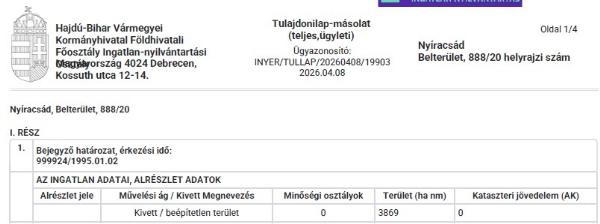Fekvése: belterület. Területe: 3869 m2. Tulajdoni jellege: személyi. Megközelíthetősége: kiépített, pormentes út. Rendeltetése: beépítetlen terület. Az ingatlan értékének és leírásának a megállapítása az illetékes önkormányzat által került kiállításra. Az ingatlan nem minősül lakóingatlannak