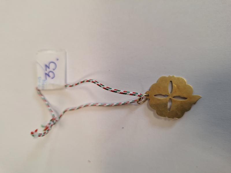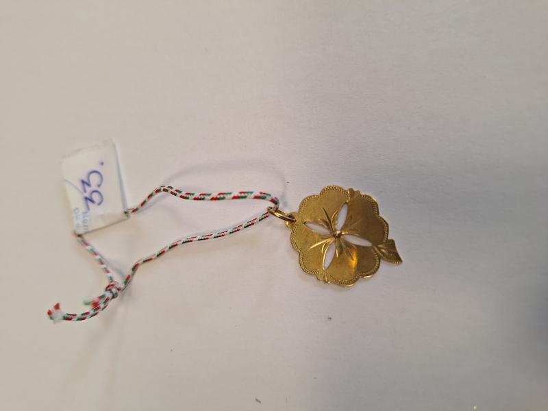 1 db 585 ‰ (14 karát) finomságú aranyötvözetből készült,áttört lóhere medál. Külföldi eredetű, 1999 és 2006 közötti szabályos magyar behozatali fémjelzéssel ellátva. Aranytárgynak minősül. Használt, kopott állapotban. Az ingóság MEGTEKINTÉSE az árverésen történő részvétel előtt a meghirdetett időpontban ajánlott.Az elárverezett vagyontárgyakért sem az adós,sem az adóhatóság jótállással nem tartozik,felelősséget nem vállal.A megtekintés során a résztvevők által nem észlelt vagy fel nem ismerhető rejtett hibákért,a vagyontárgy esetlegesen előforduló vélt vagy valós hiányosságaiért az adóhatóság felelősséget nem vállal.