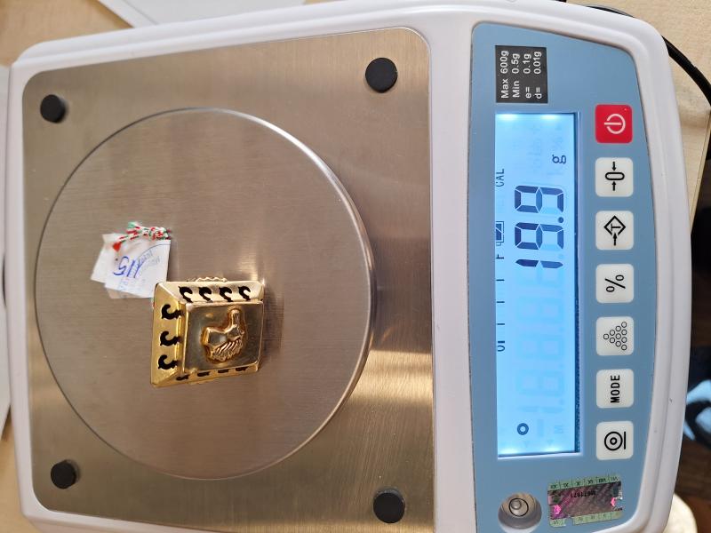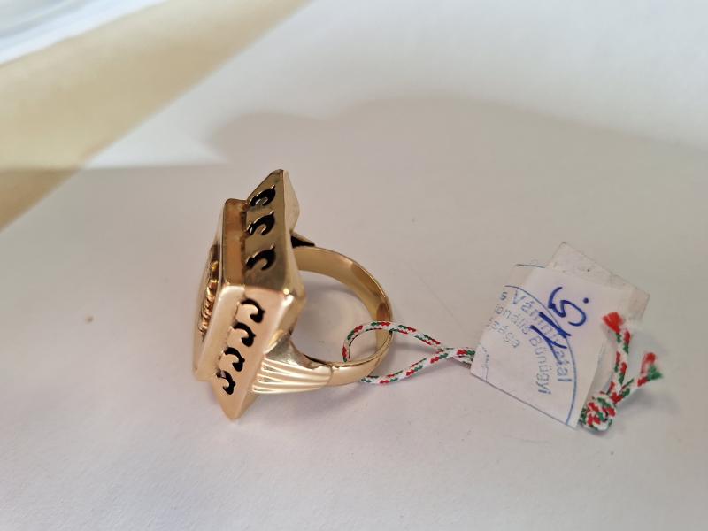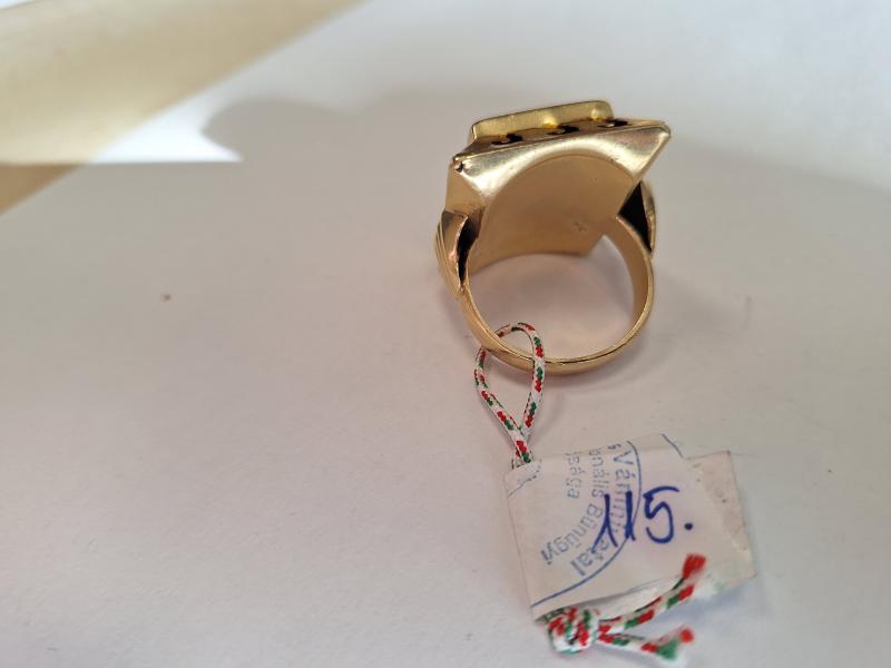 1 db 585 ‰ (14 karát) finomságú aranyötvözetből készült,pecsétgyűrű. Téglalap alakú fejrészén, rátett lófej díszítés.Jelzés, illetve fémjelzés nélkül. Aranytárgynak minősül. Használt, kopott, deformált állapotban. Az ingóság MEGTEKINTÉSE az árverésen történő részvétel előtt a meghirdetett időpontban ajánlott.Az elárverezett vagyontárgyakért sem az adós,sem az adóhatóság jótállással nem tartozik,felelősséget nem vállal.A megtekintés során a résztvevők által nem észlelt vagy fel nem ismerhető rejtett hibákért,a vagyontárgy esetlegesen előforduló vélt vagy valós hiányosságaiért az adóhatóság felelősséget nem vállal.