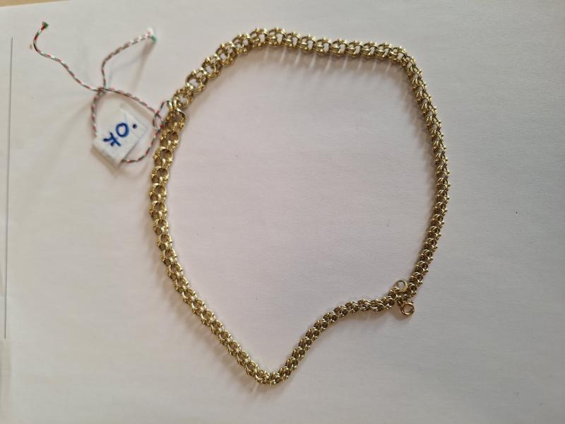 1 db 585 ‰ (14 karát) finomságú aranyötvözetből készült,mintás, collier (nyakék). 46 cm hosszú, rugós gyűrű zárral.Külföldi eredetű, 1966 és 1999 közötti szabályos magyar behozatali fémjelzéssel ellátva. Aranytárgynak minősül. Használt állapotú. Az ingóság MEGTEKINTÉSE az árverésen történő részvétel előtt a meghirdetett időpontban ajánlott.Az elárverezett vagyontárgyakért sem az adós,sem az adóhatóság jótállással nem tartozik,felelősséget nem vállal.A megtekintés során a résztvevők által nem észlelt vagy fel nem ismerhető rejtett hibákért,a vagyontárgy esetlegesen előforduló vélt vagy valós hiányosságaiért az adóhatóság felelősséget nem vállal.