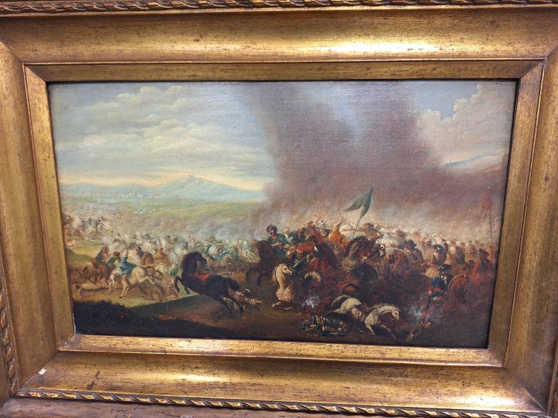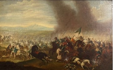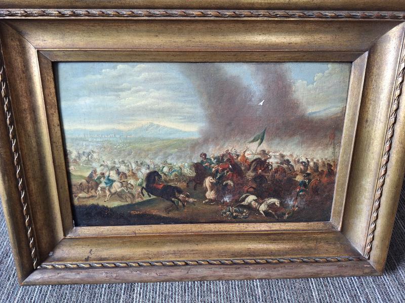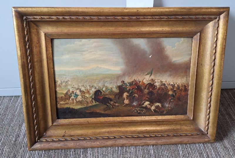 C. L. F. von Löwenstern (1701-1754): Csatatéri jelenet o.v., 57,5x41,5 cm, j.n. Festő: Christian Ludwig Freiherr von Löwenstern Kerettel együtt a mérete: 57,5x41,5 cm Anyaga: olaj, vászon Az ingóság MEGTEKINTÉSE az árverésen történő részvétel előtt a meghirdetett időpontban ajánlott.Az elárverezett vagyontárgyakért sem az adós,sem az adóhatóság jótállással nem tartozik,felelősséget nem vállal.A megtekintés során a résztvevők által nem észlelt vagy fel nem ismerhető rejtett hibákért,a vagyontárgy esetlegesen előforduló vélt vagy valós hiányosságaiért az adóhatóság felelősséget nem vállal.