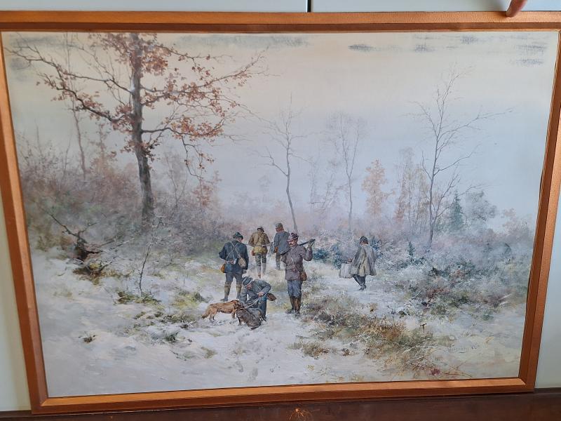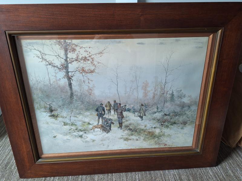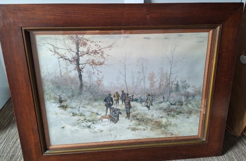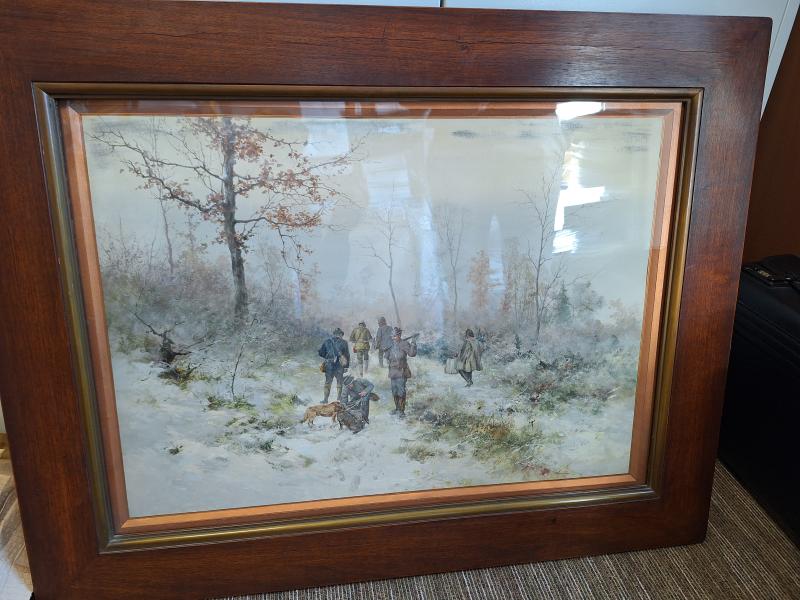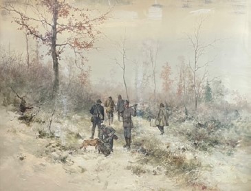 Neográdi Antal (1861-1942): Vadászokat ábrázoló téli kép akvarell, papír, 94,5x73 cm, j.j.l.:: Neogrády A. Kerettel együtt a mérete: 94,5x73 cm Anyaga: akvarell, papír Az ingóság MEGTEKINTÉSE az árverésen történő részvétel előtt a meghirdetett időpontban ajánlott.Az elárverezett vagyontárgyakért sem az adós,sem az adóhatóság jótállással nem tartozik,felelősséget nem vállal.A megtekintés során a résztvevők által nem észlelt vagy fel nem ismerhető rejtett hibákért,a vagyontárgy esetlegesen előforduló vélt vagy valós hiányosságaiért az adóhatóság felelősséget nem vállal.