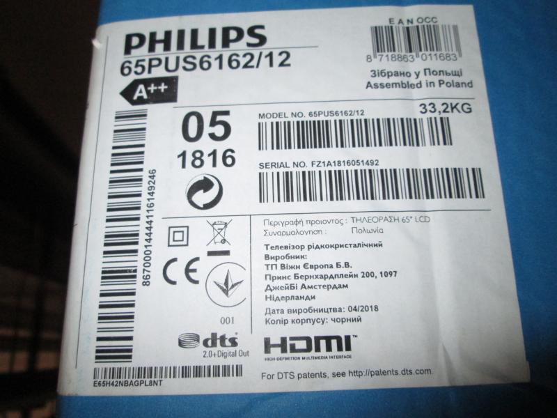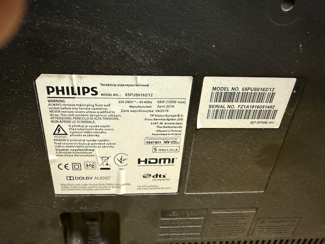 Modelszám: 65PUS6162/12; Serial no: F21A1816051492; évjárat: 2018/04; fekete színű; 164 cm átmérő/ 65'; 1 db távirányító; 1 db tápkábel; 1 db doboz; a készüléknek nincs talpa, fali konzolhoz csatlakozó sínnel van ellátva; működőképes; Az elárverezett vagyontárgyakért sem az adós, sem az adóhatóság jótállással nem tartozik. A megtekintés során a résztvevők által nem észlelt vagy fel nem ismerhető rejtett hibákért, a vagyontárgy esetlegesen előforduló vélt vagy valós hiányosságaiért az adóhatóság felelősséget nem vállal. Zálogjogi nyilvántartásban nem szerepel. A hirdetmény nem biztosítja az ingóság tulajdonságainak teljes körű ismertetését. A képek csak tájékoztató jellegűek!