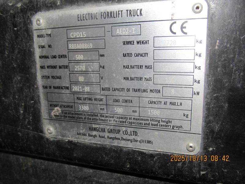 Elektromos targonca HC CPD15-AED 2-I, R8BA08869; gyártási év: 2021.08.; terhelés: 1500 kg; 3,3 m emelési magasság; kínai gyártmány