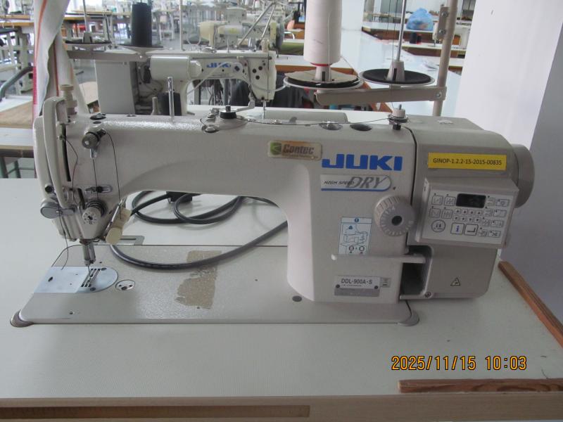 JUKI DDL-900A-S típusú gyorsvarrógép; 220V-os; kínai gyártmány; 55x107 cm-es asztallal; cérnatartóval; gyári szám: 400KE05704