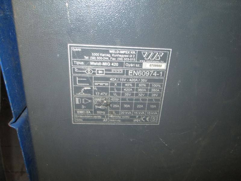 MIG-420; Weldimpex; gyáriszám: 0708660; testkábel+munkakábel+reduktor; Az elárverezett vagyontárgyakért sem az adós, sem az adóhatóság jótállással nem tartozik. A megtekintés során a résztvevők által nem észlelt vagy fel nem ismerhető rejtett hibákért, a vagyontárgy esetlegesen előforduló vélt vagy valós hiányosságaiért az adóhatóság felelősséget nem vállal. Zálogjogi nyilvántartásban nem szerepel. A hirdetmény nem biztosítja az ingóság tulajdonságainak teljes körű ismertetését. A képek csak tájékoztató jellegűek! Az ingóságok átvétele az árverési vételár megfizetése után az ügyintézővel történő egyeztetés alapján előre meghatározott napon történik!