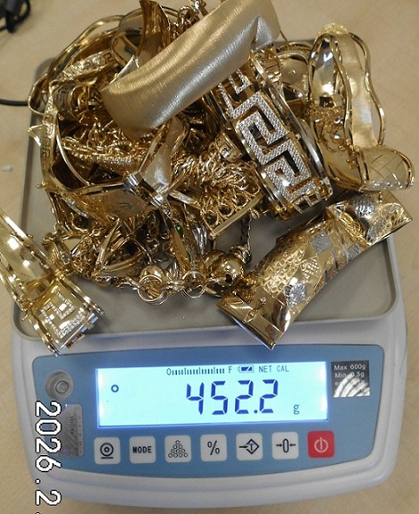452,2 gramm roncsolt, alaktalanított 14 karátos arany ékszerek. A bemutatott tárgyak kadmium koncentrációja eléri, illetve meghaladja a 0,01 tömegszázalékot, ezért az Európai Unió területén kereskedelmi forgalomba nem hozható. A nemesfém tárgyak nem rendelkeznek magyar fémjellel és névjellel. Vámtarifaszám: 7115. A fenti vámtarifaszám alá tartozó tételt a meghirdetés időpontjában 3%-os vámtétel, valamint 27%-os ÁFA terheli, melyek alapját a vételár képezi. Az árverezett tárgyakért a NAV jótállással nem tartozik, a vagyontárgy esetlegesen előforduló vélt vagy valós hiányosságaiért az adóhatóság felelősséget nem vállal.
