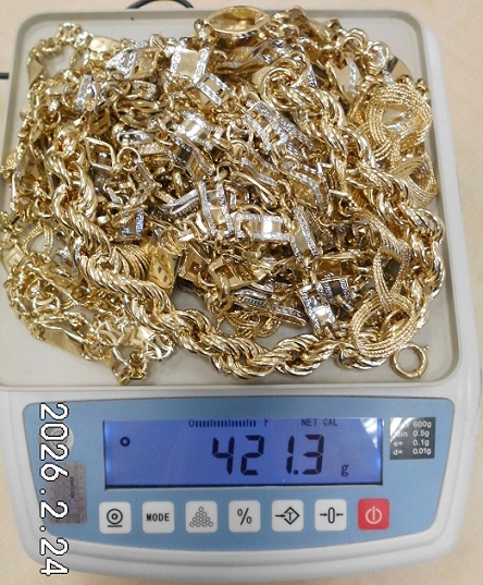 421,3 gramm roncsolt, alaktalanított 14 karátos arany karkötők. A bemutatott tárgyak kadmium koncentrációja eléri, illetve meghaladja a 0,01 tömegszázalékot, ezért az Európai Unió területén kereskedelmi forgalomba nem hozható. A nemesfém tárgyak nem rendelkeznek magyar fémjellel és névjellel. Vámtarifaszám: 7115. A fenti vámtarifaszám alá tartozó tételt a meghirdetés időpontjában 3%-os vámtétel, valamint 27%-os ÁFA terheli, melyek alapját a vételár képezi. Az árverezett tárgyakért a NAV jótállással nem tartozik, a vagyontárgy esetlegesen előforduló vélt vagy valós hiányosságaiért az adóhatóság felelősséget nem vállal.