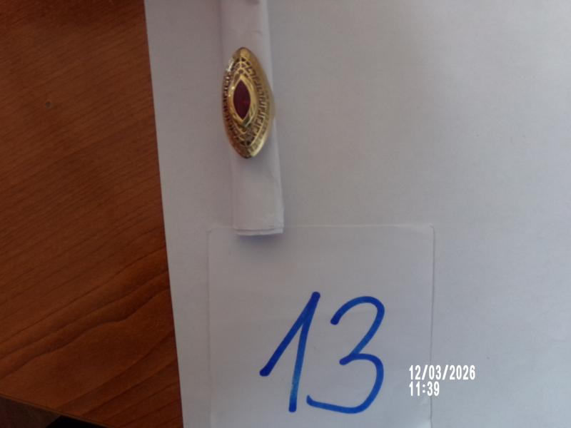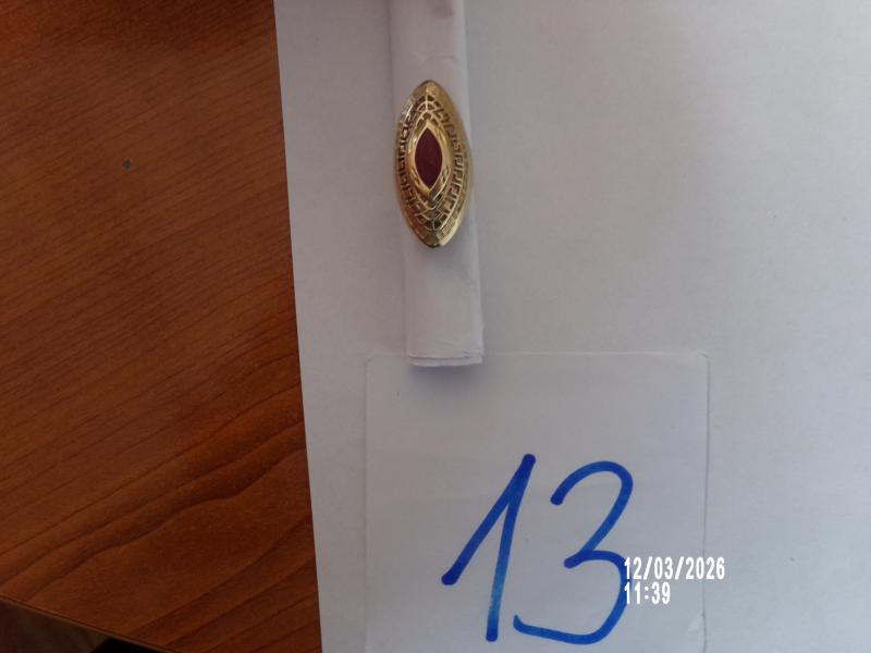 14 karátos arany gyűrű középen bordó szintetikus kővel, szélén görög mintával, véséssel.Az ingóság becsértékét szakértő-becsüs, a dolog jellemző tulajdonságainak, állapotának megfelelően a forgalmi értéket figyelembe véve határozta meg, ugyanakkor a hirdetmény nem biztosítja az ingóság tulajdonságainak teljes körű ismertetését. Az elárverezett vagyontárgyért sem az adós, sem a NAV jótállással nem tartozik. Az ingóság személyes megtekintésére az adóhatóság lehetőséget biztosít. Az ingósággal kapcsolatos egyéb információkról, paraméterekről, esetlegesen előforduló nem észlelt hiányosságokról kapcsolatban a megadott megtekintés időpontjában bárki tájékozódhat. A megtekintés során a résztvevők által nem észlelt vagy fel nem ismerhető rejtett hibákért, a vagyontárgy esetlegesen előforduló vélt vagy valós hiányosságaiért az adós, valamint az adóhatóság felelősséget nem vállal. Az ingóság MEGTEKINTÉSE az árverésen történő részvétel előtt a MEGHIRDETETT IDŐPONTBAN AJÁNLOTT! Az árverés tárgyát képező és az árverés kiírásban megnevezett tételen kívül a fotókon akár részben akár egészben látható egyéb tárgyak nem képezik az árverés részét. A fenti adatok és az ingóságról készült képfelvételek tájékoztató jellegűek! Sikeres árverés esetén az ingóság nyertes licitáló részére történő átadása, előre telefonon egyeztetett időpontban történik.