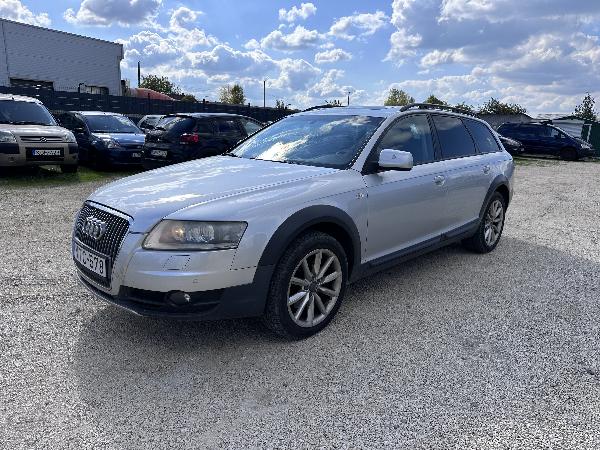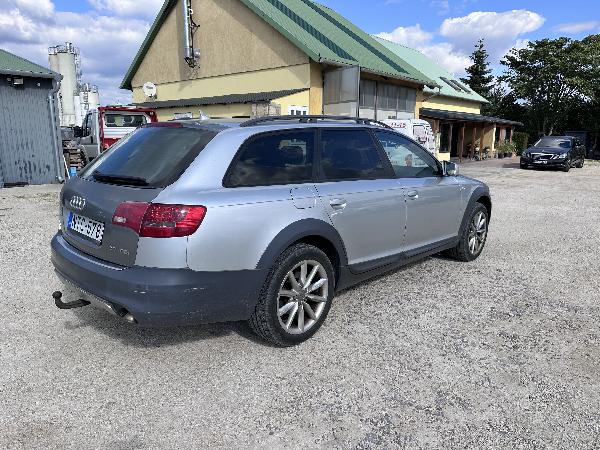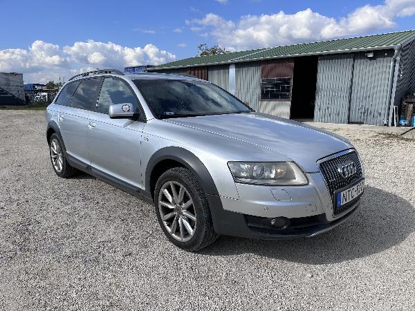AUDI A6 ALLROAD QUATTRO. Gumik állapota: közepes. Diesel üzemű. Jobb első ajtó sérült. Jobb tükör borítás repedt. Bal hátsó lámpa törött, a fényezés alatta sérült. Hátsó lökhárító sérült, karcos. Járó motornál hibakód. Hátsó ajtó cserélve, eredeti a csomagtartóban.