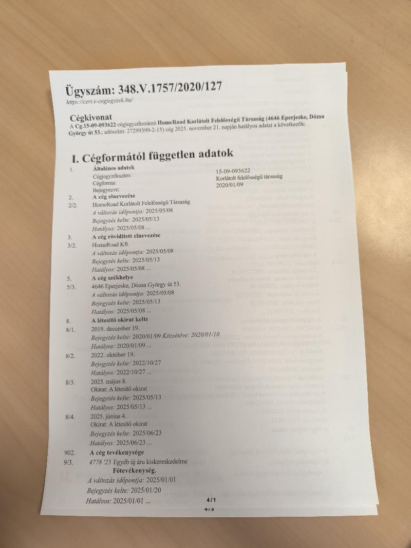 HomeRoad Kft.-ben lévő (cg.:15-09-093622)- ben lévő adósi üzletrész.