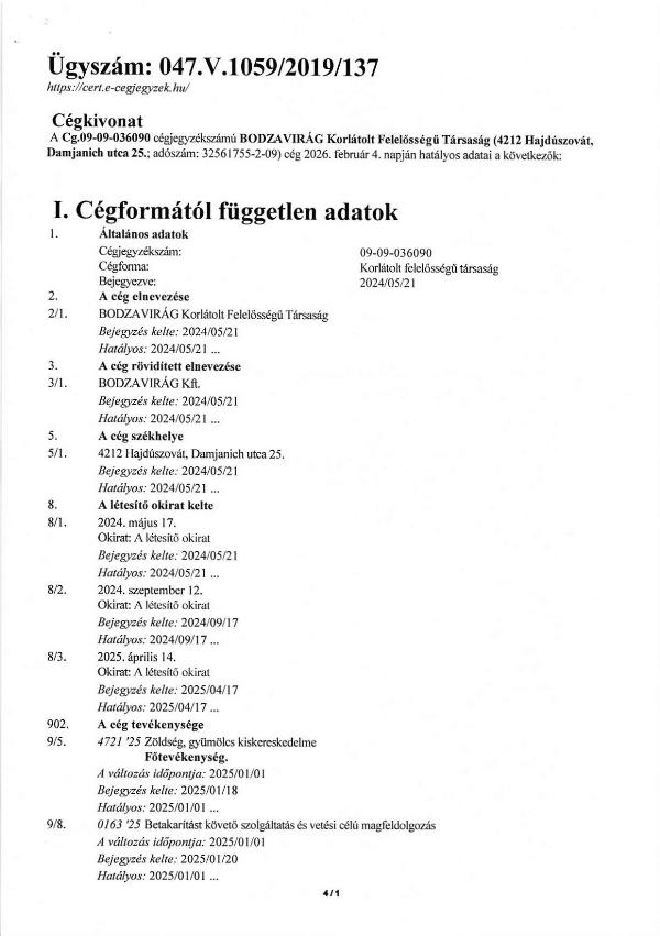 Balogh Béla adóst illető üzletrész az alábbi gazdasági társaságban: Cég neve:BODZAVIRÁG Korlátolt Felelősségű Társaság Cég székhelye: 4212 Hajdúszovát, Damjanich u. 25. Cégjegyzék száma:09-09-036090 Adószám:32561755-2-09