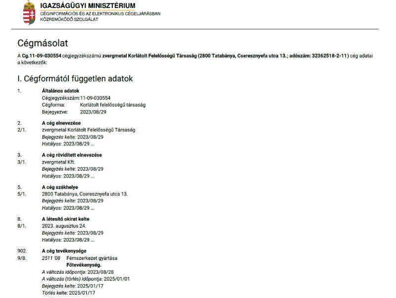 zvergmetal KORLÁTOLT FELELŐSSÉGŰ TÁRSASÁG (cégjsz.:11-09-030554)