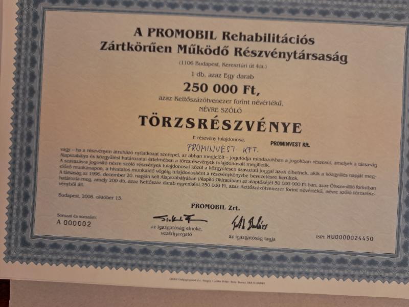 árverésre kerül az adós tulajdonában álló a Promobil Zrt. 0000001-0000160 sorszámú törzsrészvény (160 db) egyenként 250.000.- Ft névértékű, összesen 40.000.000 forint névértékben. A részvények nyomdai úton előállított értékpapírok és vagyonösszességként kerülnek árverésre. ISIN: HU 0000024450