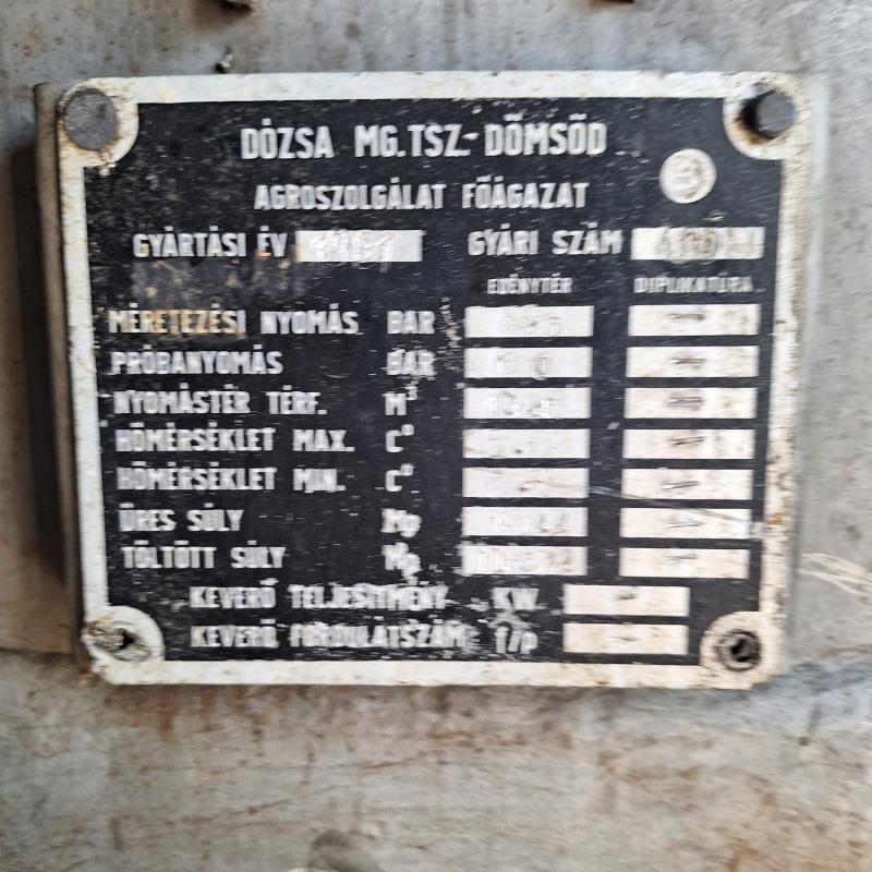 10.000 literes rozsdamentes tartály. Gyártási év: 1981. gyári szám: 402, Mérete 4,1m magas, 2 méter széles. Az elárverezett vagyontárgyakért sem az adós, sem az adóhatóság jótállással nem tartozik. A megtekintés során a résztvevők által nem észlelt vagy fel nem ismerhető rejtett hibákért, a vagyontárgy esetlegesen előforduló vélt vagy valós hiányosságaiért az adóhatóság felelősséget nem vállal. Az árverés tárgyát képező, az árverési kiírásban szereplő tételen kívül a fotókon akár részben akár egészben látható egyéb tárgyak nem képezik az árverés tárgyát.