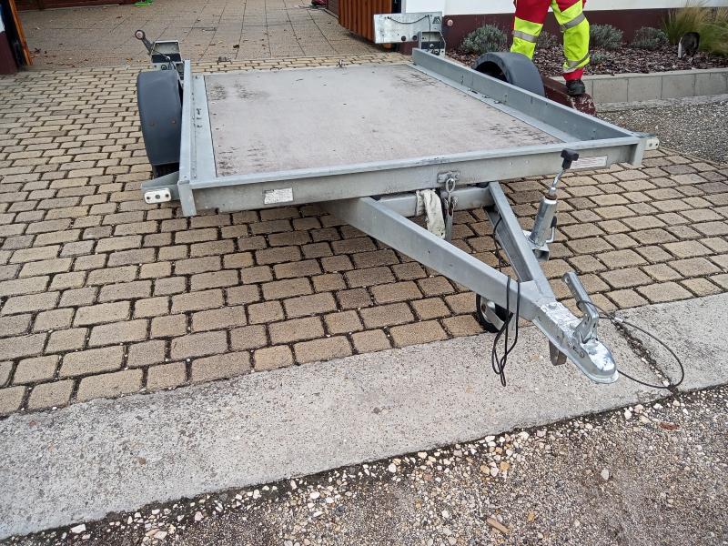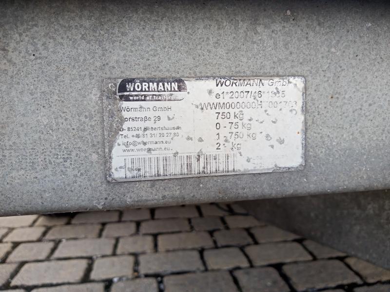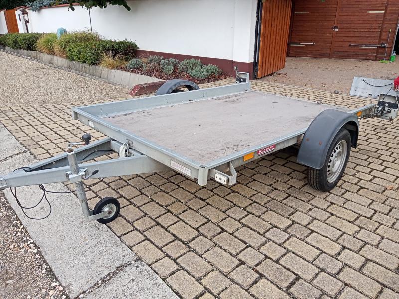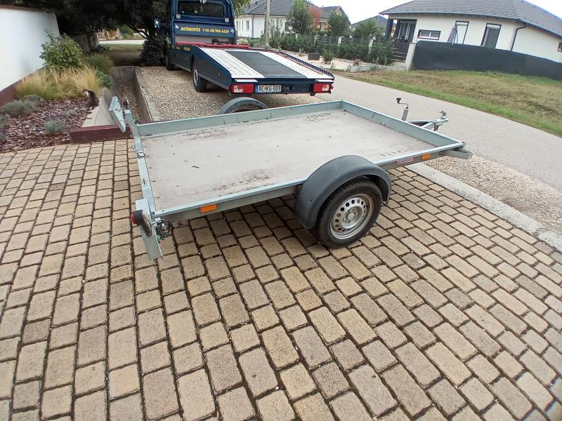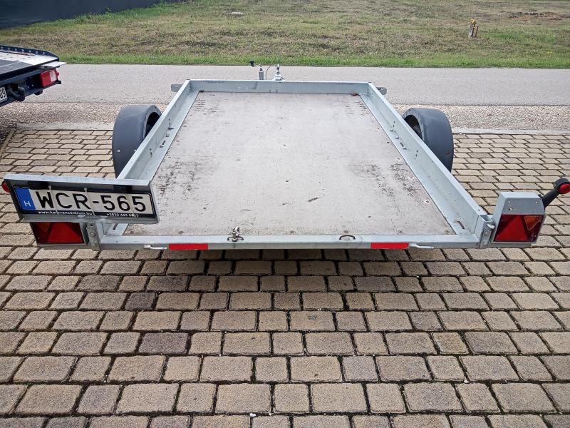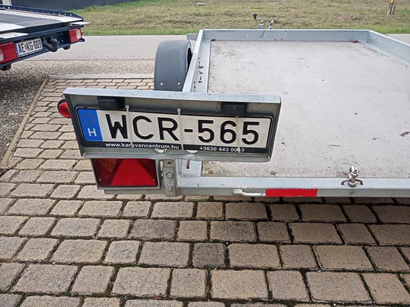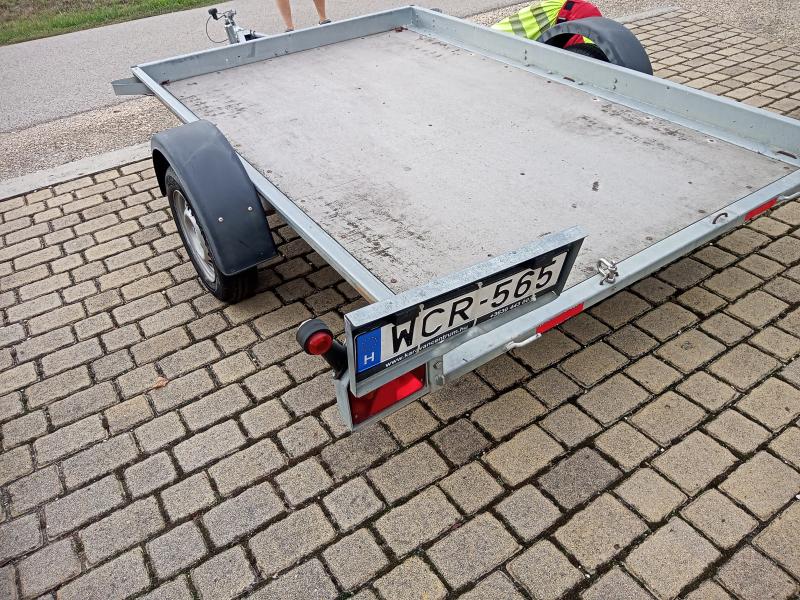 Egyéb felszereltség, jellemzők | Közép-tengelyes pótkocsi. Billenthető rakfelület. Gumik: Laufenn, újszerű. Rendszámtartó tábla görbült. Hátsó ajtó hiányzik. Össztömeg 750 kg. |